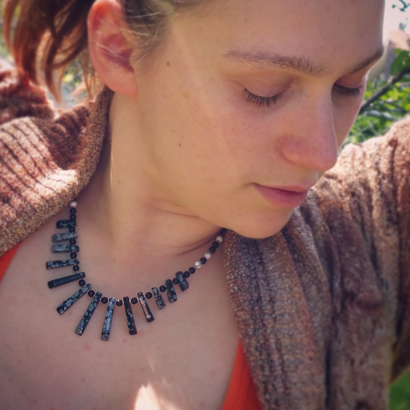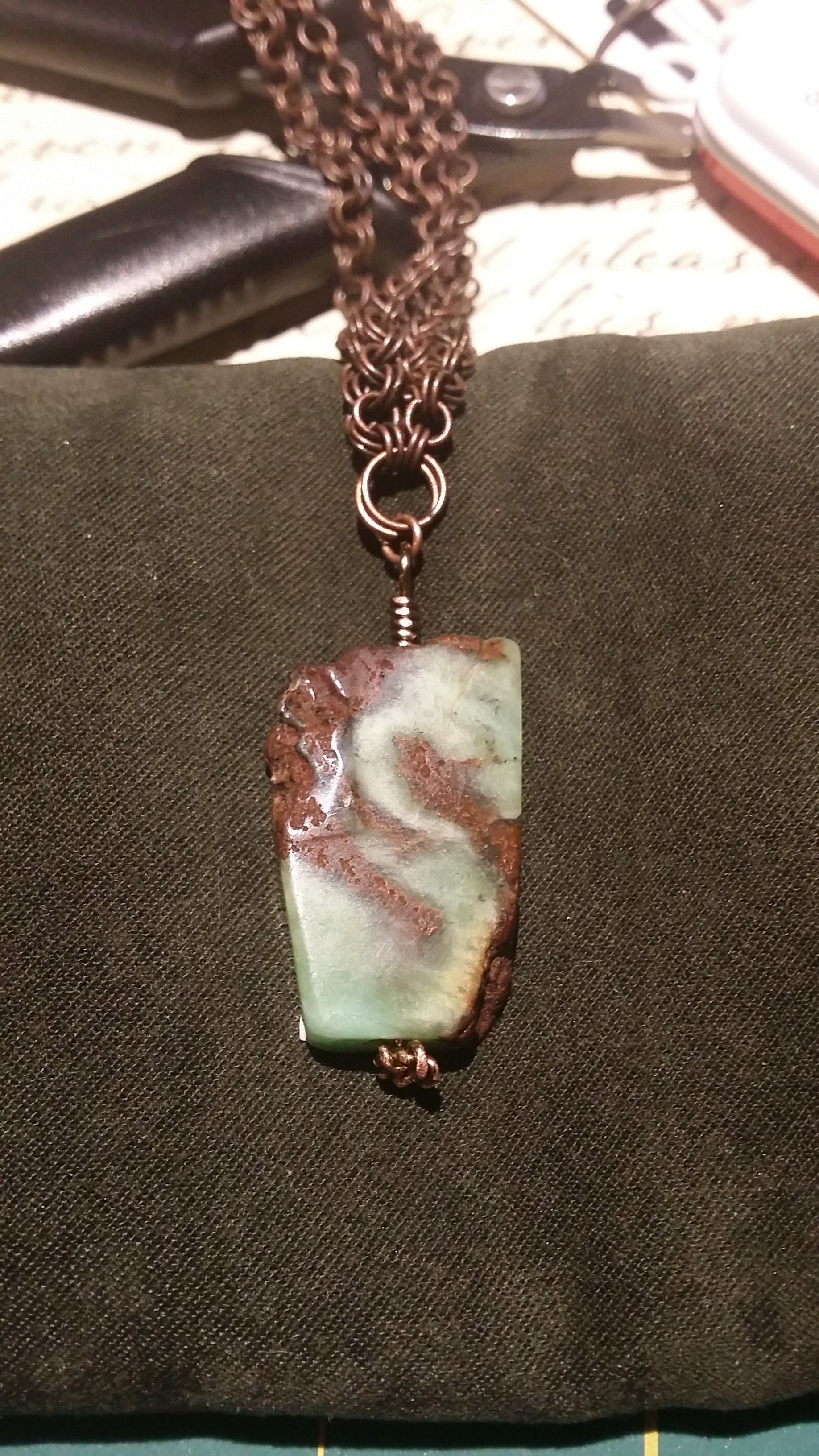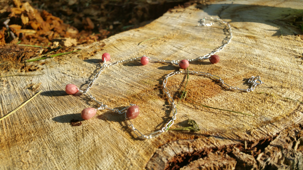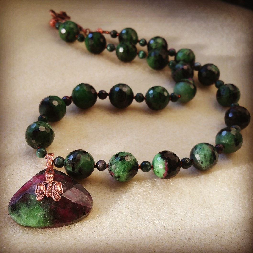 [Necklaces] rhodonite with argentium silver howlite and onyx with gunmetal chain Labradorite set in silver Springtime Elfinwear lapis lazuli and antiqued copper chrysoprase and antiqued copper moss agate donut with red bronze fleur-de-lis, and copper chain with preciosa seed beads Emerald drops on silver Hand knotted pearls with red jasper Lapis lazuli and turquoise on unfinished silver chain Ruby in Zoisite with copper findings Snowflake Jasper and Magnesite [Earrings]
