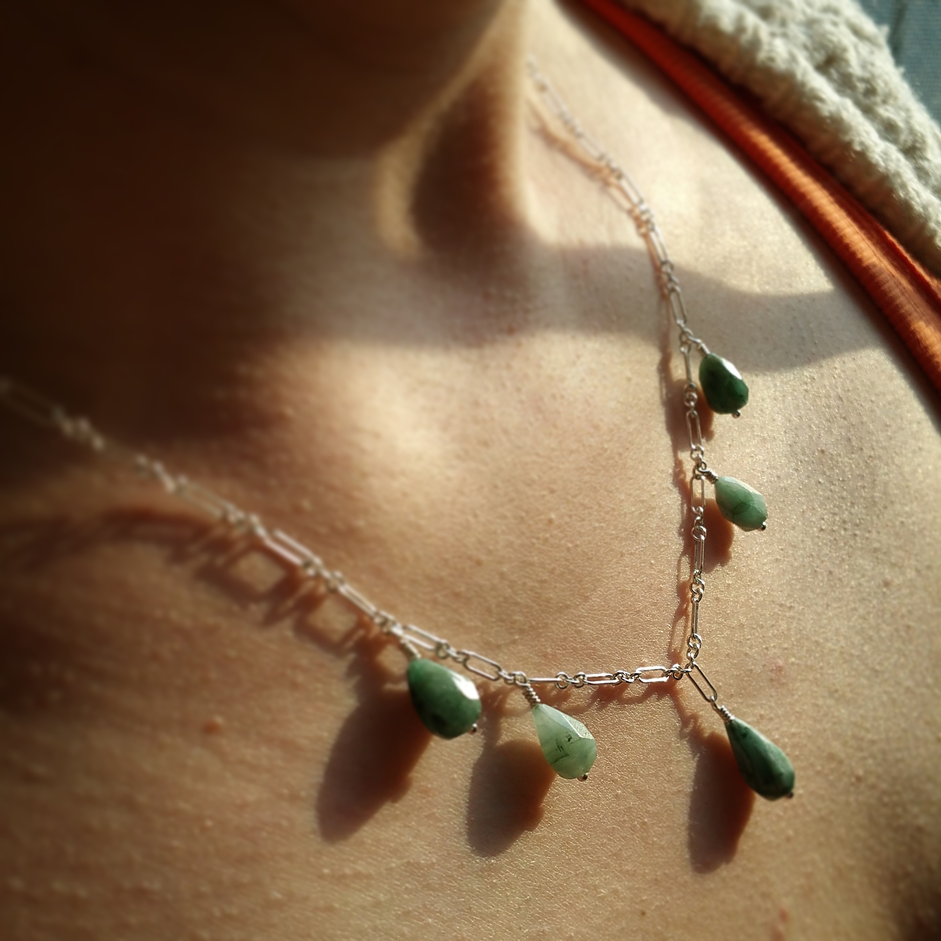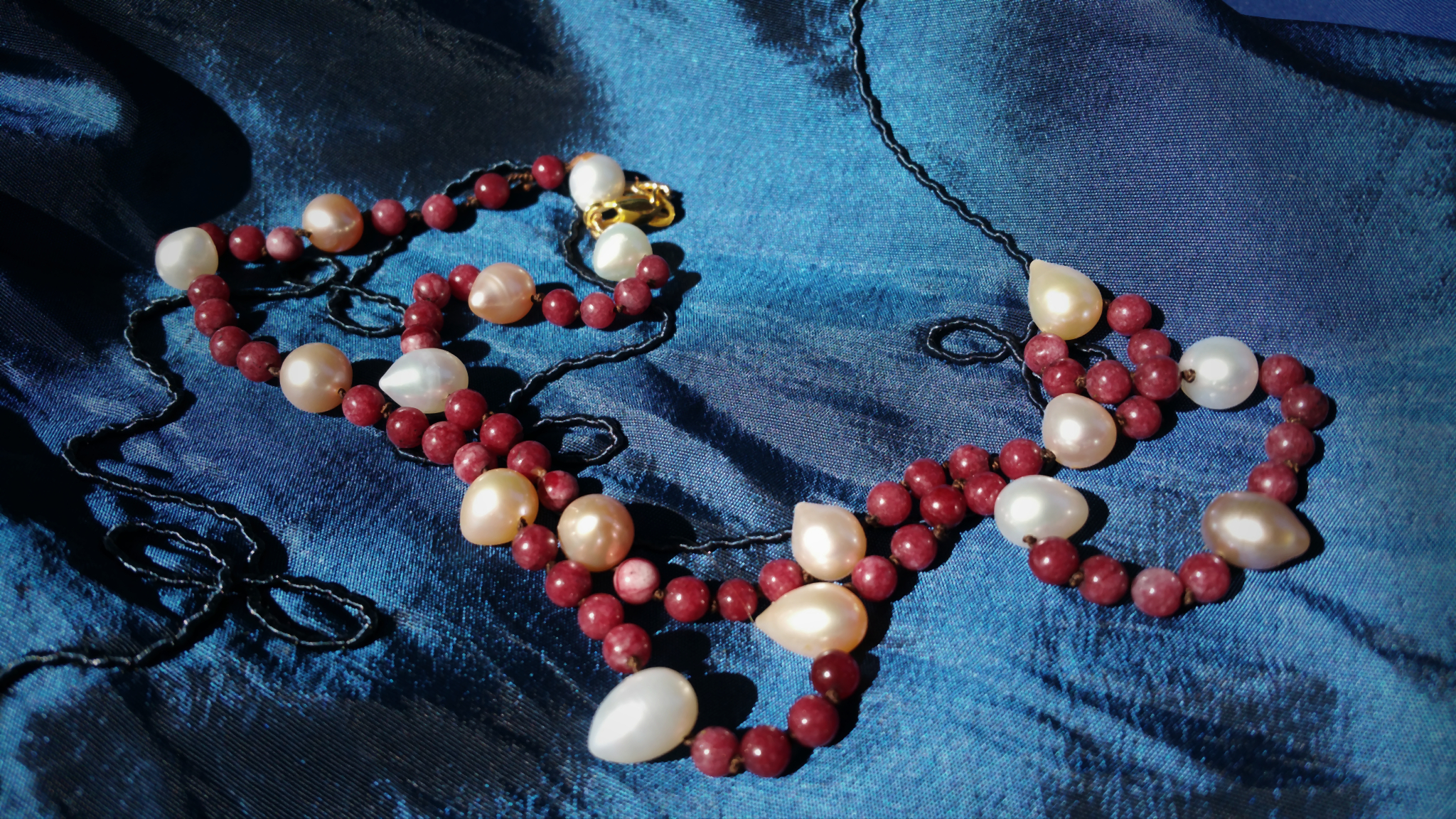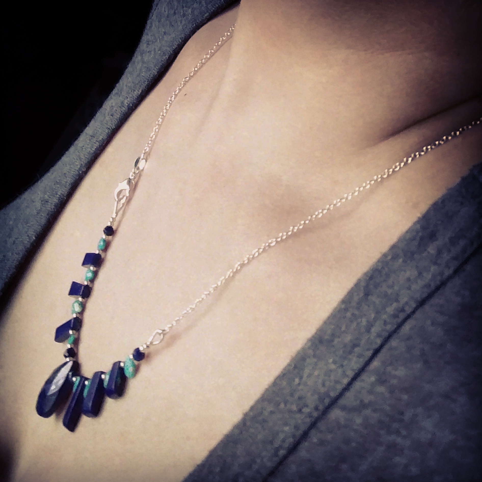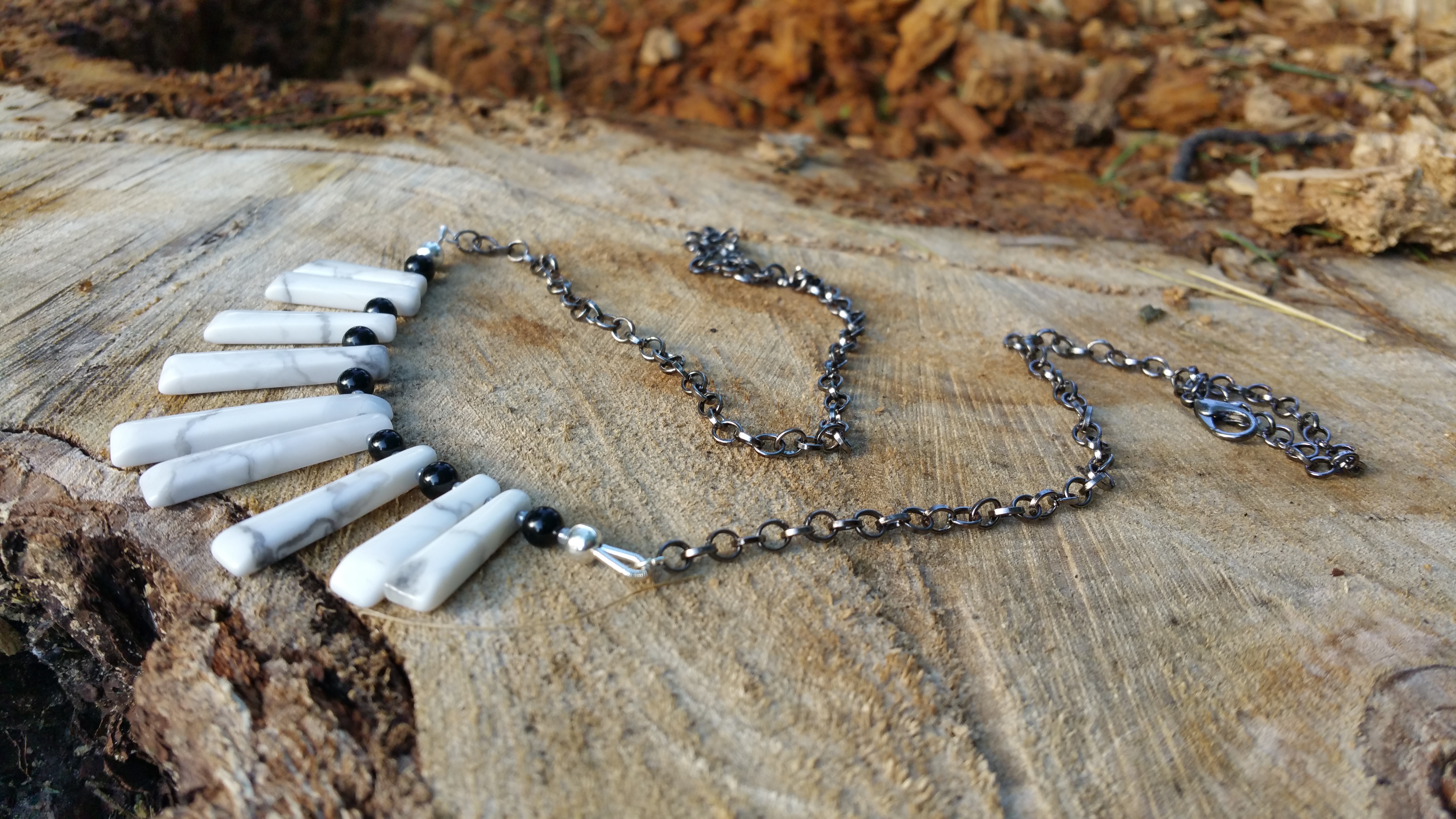 [Necklaces] rhodonite with argentium silver howlite and onyx with gunmetal chain Labradorite set in silver Springtime Elfinwear lapis lazuli and antiqued copper chrysoprase and antiqued copper moss agate donut with red bronze fleur-de-lis, and copper chain with preciosa seed beads Emerald drops on silver Hand knotted pearls with red jasper Lapis lazuli and turquoise on unfinished silver chain Ruby in Zoisite with copper findings Snowflake Jasper and Magnesite [Earrings]